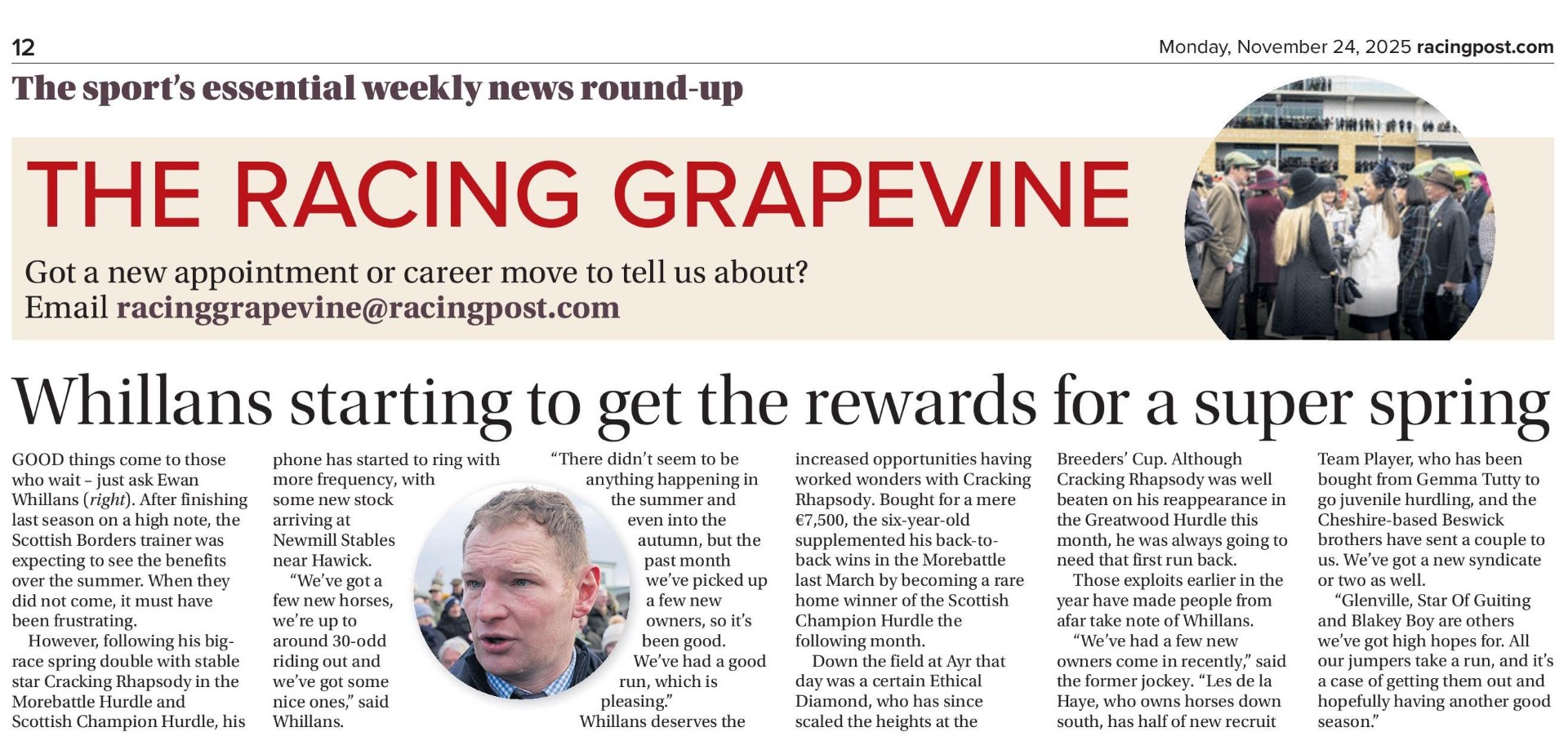 We’re delighted to see Foundation Course graduate, now racehorse trainer, Ewan Whillans, in the Racing Post news on Monday 24th November 2025.